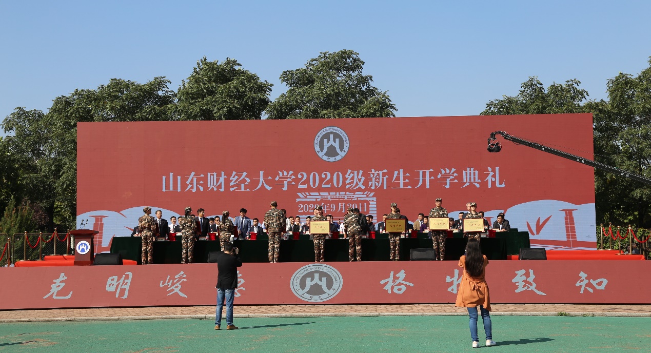 9�30日上午,山东财经大学2020级新生开学典礼在圣井校区田径场隆重举行。军训团政委、校党委学生工作部、学生工作处处长王剑宣读了《关于表�2020年国防教育先进集体、优秀军训学生、优秀教官的决定》。经济学院被评为军训工作先进单位,付雯被评为国防教育先进工作者,2019级经济学二班王政、刘青源被评为国防教育优秀志愿者,刘博�25名同学被评为优秀军训学生�2020级经济学类二班刘云卿�2020级经济学类三班冯文宣、孟哲、赵莹莹�2020级经济学类五班黄兴,2020级经济学类八班王瑛获得优秀新生入学奖学金,2020级经济学类八班孙逸松获得生源基地优秀新生奖学金�