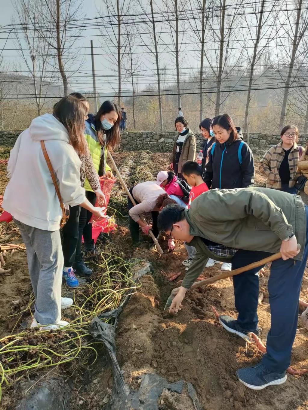 教职工们来到农田,就看到大片的蜜薯地,乡村空气香甜清冽,沁人心脾。勤劳的村民正在秋收劳作,一派繁忙景色。蜜薯的叶子经霜枯萎,覆盖在土垄上,蜜薯就藏在叶子下面的沙土里,老师们迫不及待地簇拥着来到地里,开始采挖活动,有“单打独斗”的,有互相合作的,带孩子的教工还抓住机会现场普及植物生长知识,场面十分热闹欢乐,大家充分体验到了劳动的乐趣�