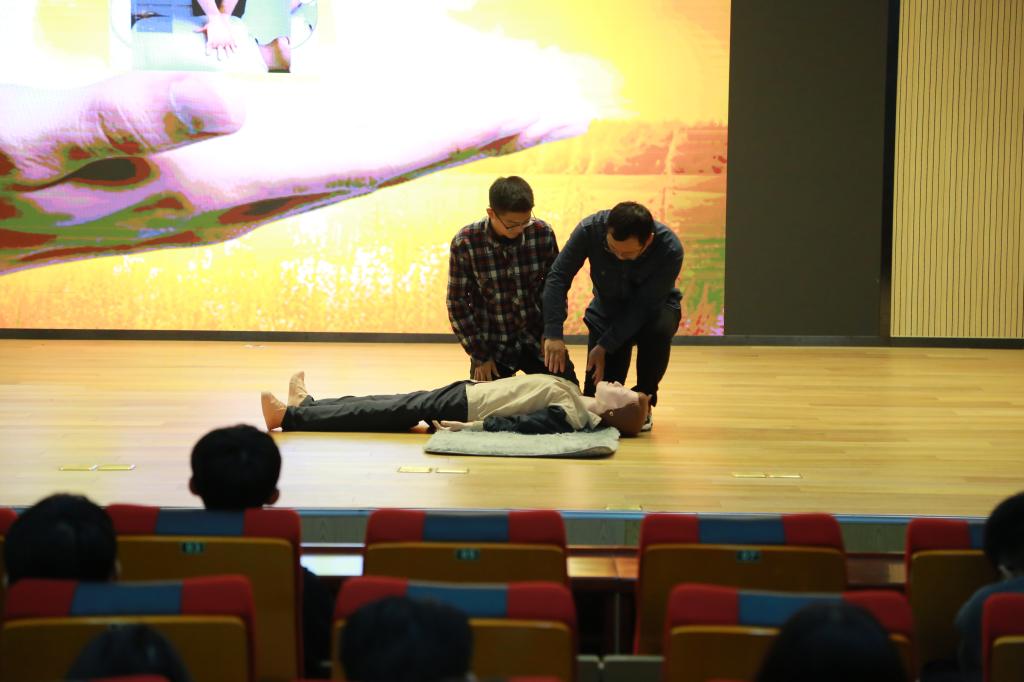 最后,孙丽随行专业医师示范了心肺复苏法,生动形象地传授了急救技能,随后邀请志愿者同学上台亲身体验实施心肺复苏术,亲身感受便于同学们掌握心肺复苏法的操作技能�