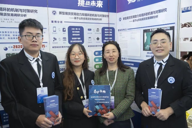 �2021级研究生杨文秀担任负责人,王鑫廷、冀兆鹏、闫伟、王克轩、李晓庆、赵欣楠、李晓涵担任团队成员,白洁、邵瑛瑛、陈浩为指导老师,自校赛启动以来,学院团委高度重视,统筹安排部署,精心组织,广泛动员,克服重重困难,创新工作思路,积极孵化培育项目,精心打磨提升作品,看似一帆风顺的背后,是无数老师及同学的不断努力,让项目经历了质的蜕变。本项目以“易货贸易”为研究对象,通过对易货贸易追根溯源,梳理现代易货贸易现状,提取现代易货贸易多维化、媒介化、数字化、平台化典型特征;结合产业理论、贸易理论、博弈模型,对易货贸易有效畅通“内循环”和“外循环”的运行机理进行系统阐述并提出相应假说;同时鉴于易货贸易数据披露机制尚不健全,团队深入山东省内易货贸易公司进行实际调研,以山东省案例视角对易货贸易促进双循环进行实证分析,继而总结提炼出山东省易货贸易困境,提出促进易货贸易跨越式发展的可行性方案�