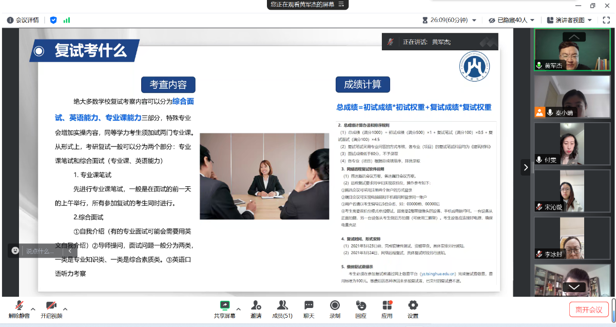 黄军杰是山东财经大学就业导师、山东省教育发展委员会理事,有着十余年的考研规划指导经验。会议伊始,黄军杰对今年的考研难度和复试调剂形式进行了分析,主要围绕复试的重要性,复试的考察内容、复试前的准备及调剂的政策、调剂的注意事项、调剂平台、调剂具体操作等方面进行详细讲解;随后,针对考研调剂方面,黄军杰向同学们介绍了近几年来考研调剂详细情况,面对考研形势逐年愈发严峻以及就业难的背景下,他表示,同学们要根据成绩做出判断,在有限的时间内,通过校内校外信息渠道收集更多调剂信息,不要盲目二战,珍惜每一个升学机会;最后,黄军杰表示,欢迎同学们随时与他交流考研问题,一定会尽力为大家提供相关建议指引,帮助大家圆梦研究生�