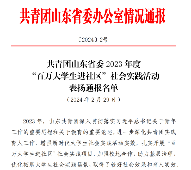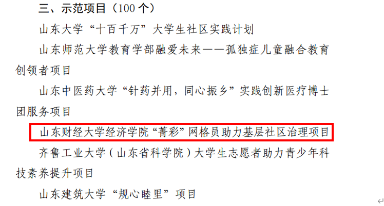 (通讯员:付雯 姜琛)近日,山东财经大学经济学院“菁彩”网格员助力基层社区治理项目获批共青团山东省�2023年党建带团建改革创新试点项目,共青团山东省委2023年度“百万大学生进社区”社会实践活动示范项目,姜琛同学获共青团山东省委2023年度“百万大学生进社区”社会实践活动先进个人�