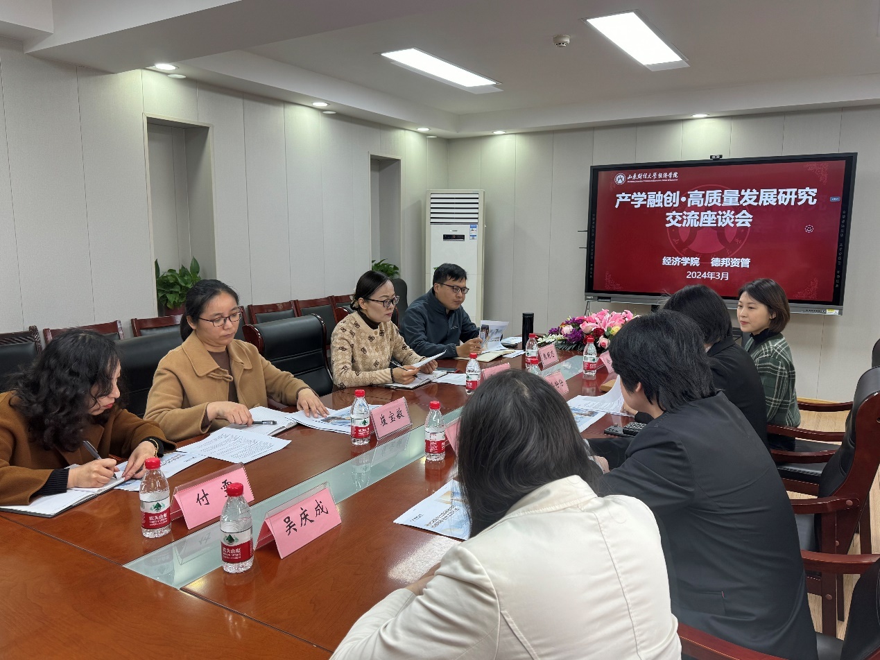 (通讯员:付雯�3�28日,经济学院在舜耕校区办公楼会议室与德邦证券资产管理有限公司举办产学融创·高质量发展研究交流座谈会。德邦资管总经理徐盼盼、德邦证券财富支持中心投教负责人姚芳、德邦资管销售部高级合规经理徐晨、德邦证券数智支持中心投保经理吴庆成、经济学院党委副书记李冰封,副院长崔宝敏、张明志、团委书记付雯参加座谈�
