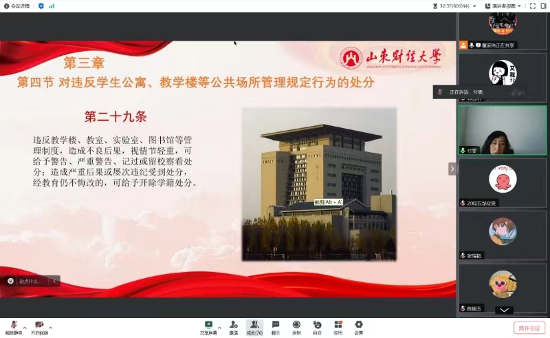 主题教育班会上,各班辅导员带领同学们系统学习《山东财经大学学生违纪处分条例》,详细介绍总则、处分的种类与适用范围、违纪行为与处分、处分权限和程序以及附则五部分的内容,重点对违纪行为与处分的五个章节逐条阐述,从危害国家安全与公共安全、扰乱社会秩序校园秩序网络秩序行为、侵犯人身权利公私财产行为、对违反学生公寓教学楼等公共场所管理规定行为和对违反学习、学术、考试纪律行为进行逐条学习重点解读,结合相关典型案例,给同学们强调了维护校园秩序、网络秩序、公寓消防安全、人身财产安全的重要性以及注意事项。临近期末考试,辅导员重点强调了《山东财经大学学生违纪处分条例》中的考试违纪行为,嘱咐同学们端正考试态度,严格遵守各项考试纪律,同时引导同学们合理规划期末复习,靠自己的努力取得优异成绩�