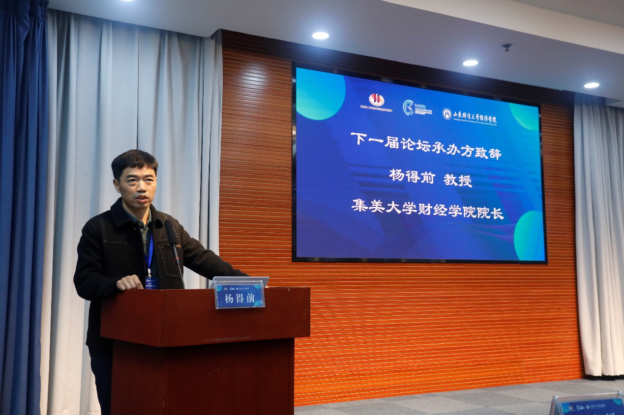 院长杨得前教授做了下一届主办方致辞,并热情、诚挚地邀请各位专家学者将于明年上半年相聚厦门、莅临美丽的集美大学进行学术论道。最后,谢申祥教授宣布了第十一届中国世界经济学科专家和中青年学者学术论坛顺利闭幕。