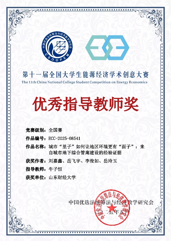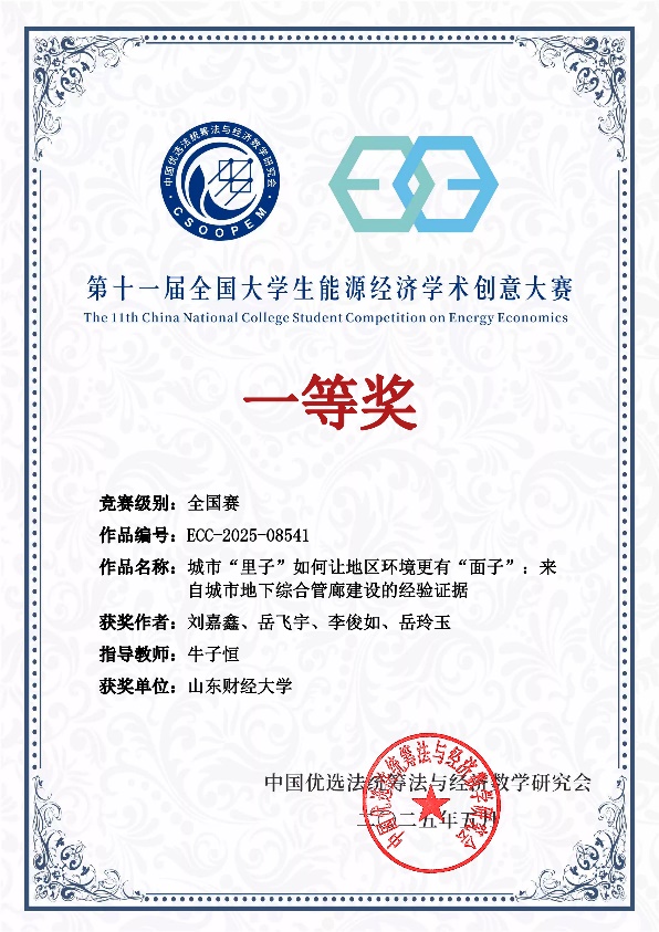 5�23�-25日,第十一届全国大学生能源经济学术创意大赛总决赛落下帷幕。我院学子获得国家级一等奖1项,三等�2项。其中,由我院教师牛子恒指导�2023级经济学专业本科生刘嘉鑫作为项目负责人的作品《城市“里子”如何让地区环境更有“面子”:来自城市地下综合管廊建设的经验证据》进入本科组全国总决赛,并获全国一等奖,牛子恒获得优秀指导教师奖,为我校在该赛事上增添了一份重要荣誉�