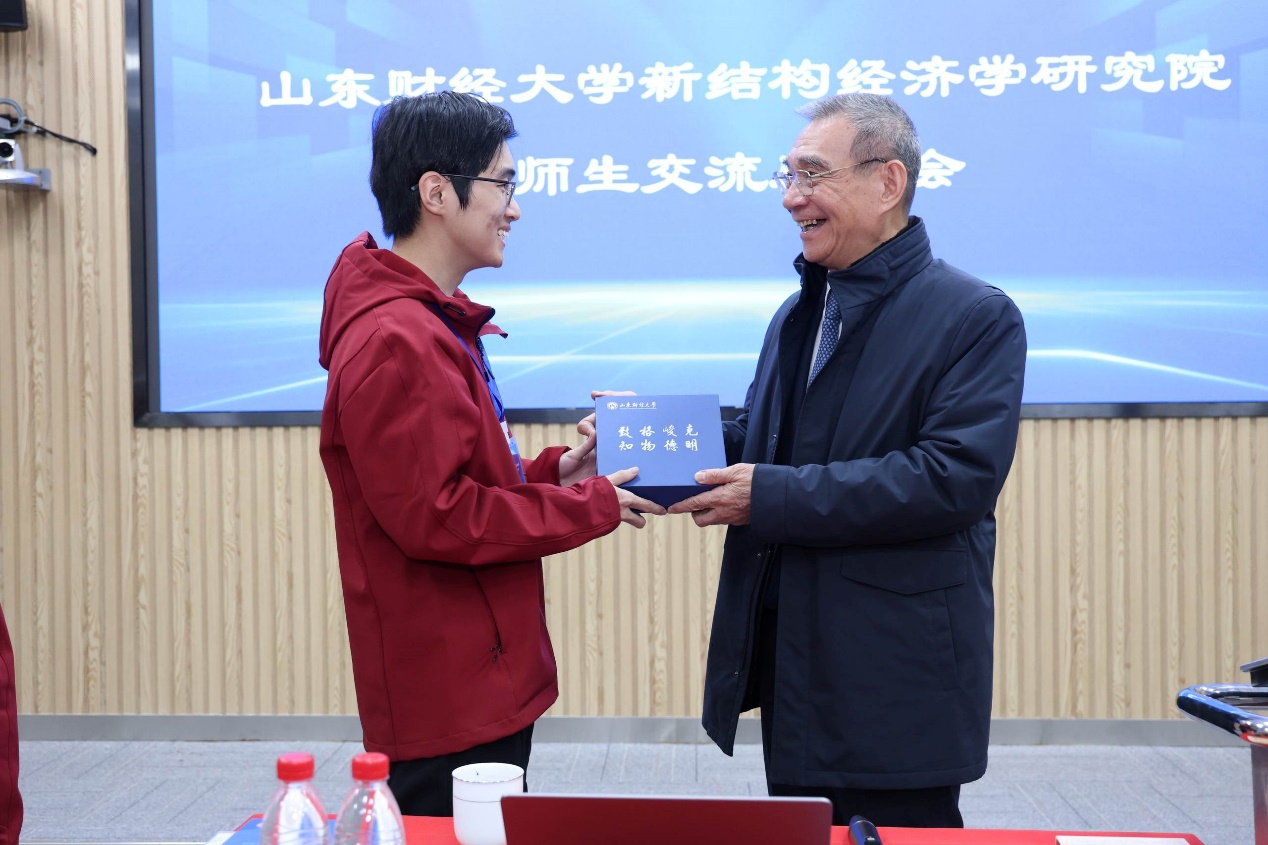 随后�2024级新结构经济学卓越人才实验班的赵一恒同学作为学生代表发言。赵一恒同学在汇报中回忆了自己与新结构经济学的不解之缘,分享了自己收到林毅夫教授回信时的激动和喜悦之情,并代表全班同学向林毅夫教授及各位领导老师做出承诺。他表示,作为新一代新结构经济学人,他们有勇气,也有信心,能够接过发展新结构经济学的接力棒,继续谱写这门学科的崭新篇章,为实现中华民族伟大复兴,构建人类命运共同体,贡献属于新结构经济学人的青春力量�