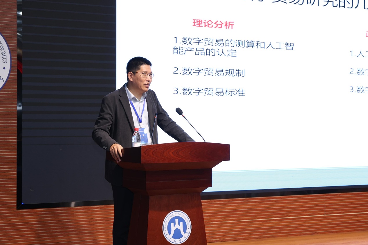 主旨报告分别由姜伟和经济学院副院长张明志主持。山东省世界经济学会会长、山东理工大学校长特别助理李平教授、西南财经大学发展规划处处长蒋为教授、对外经济贸易大学政府管理学院副院长刘斌教授、山东财经大学党委副书记谢申祥教授,分别发表了题为“全球南方制度型开放如何应对国际不确定性”、“数字企业临近、非均等赋能与出口动力转变”、“对标高水平国际数字经贸规则的逻辑主线与突破路径”、“跨境电子商务与企业成本粘性”的主旨演讲�