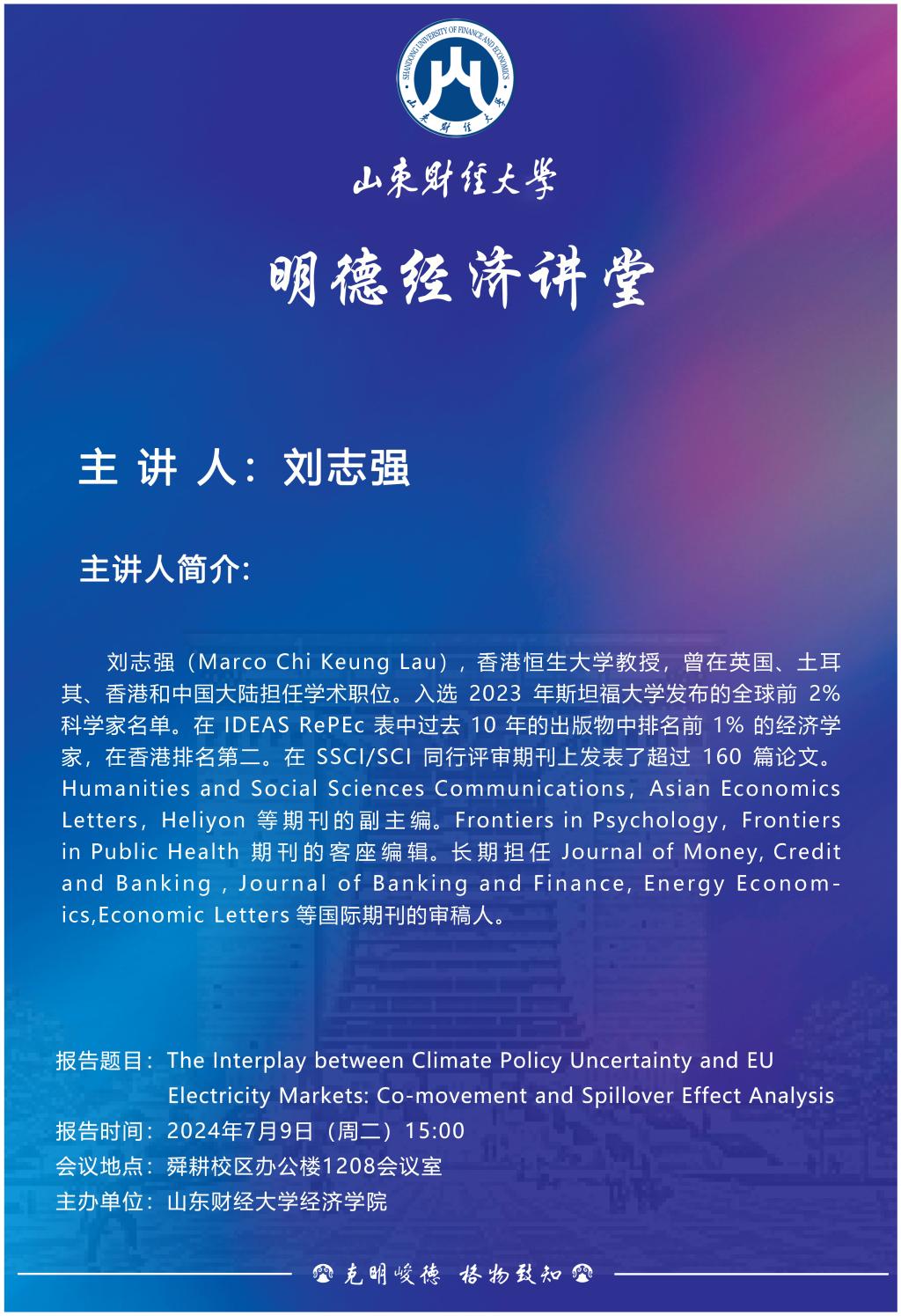 山东财经大学明德经济讲堂:The Interplay between Climate Policy Uncertainty and EU Electricity Markets: Co-movement and Spillover Effect Analysis-山东财经大学经济学院 <#webadvjs#>