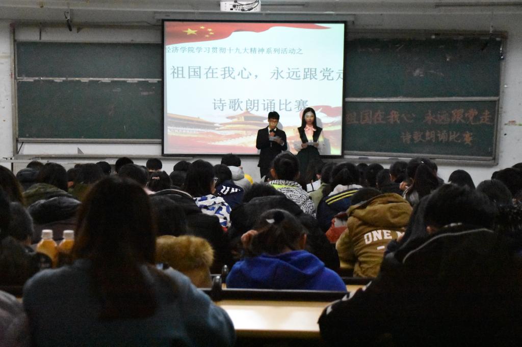 (通讯员:杨晓� 常程)为深入学习贯彻十九大精神,弘扬爱国主义精神,激发同学们的爱国情怀,增强同学们建设新时代中国特色社会主义的责任感、使命感�11�14日晚�18�30,由经济学院团委、经济学院学生会主办,经济学院学生会社团部承办的我院学习贯彻十九大精神系列活动之“祖国在我心,永远跟党走”朗诵比赛于圣井校区敏行楼B5-201举行。校广播台负责人、经济学院学生会圣井校区副部长和17级全体同学到场观看�
