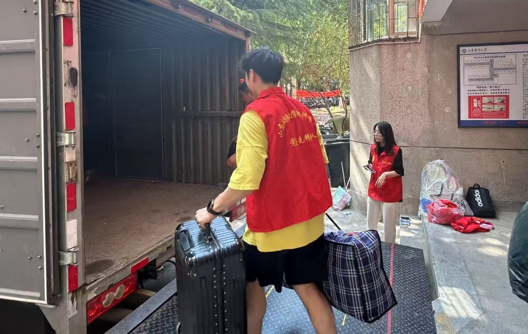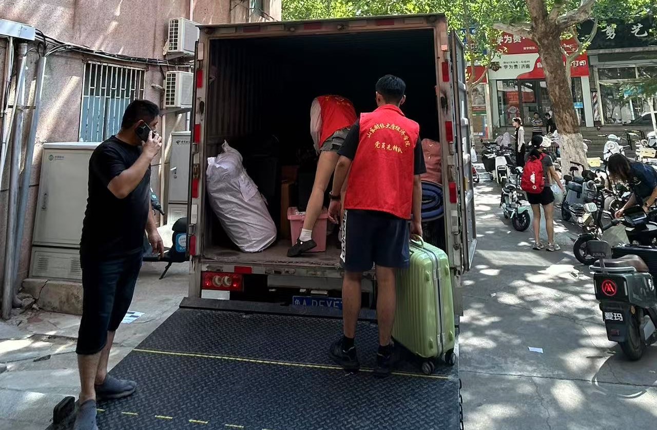 统筹协调车辆,为搬迁学生统一配备行李袋,辅导员和志愿者悉数到场,分赴各宿舍楼层节点坐镇指挥,实时协调解决突发状况,确保整个搬迁过程“零差错、零延误”,将“安全第一、服务优先”的要求落到实处。党员先锋队和志愿者身着醒目的红马甲,提前抵达搬迁现场,迅速分组、明确分工,规划搬运路线和货车调度,协助同学归纳打包、封箱并用标签清晰标识。他们积极响应,多岗位协同作战,从宿舍内接力传递行李,构筑高效搬运通道,到装车点严谨核对行李信息;从留守原宿舍楼逐间清点物品,提醒办理退宿,到引导货车装载运送路线;从协助装卸车搬运行李,安置看管零散物品,到各楼道口耐心维护秩序……志愿者们分工协作,配合默契,忙碌的身影遍布各个环节,用实际行动诠释着青春担当与无私奉献的志愿服务精神。
