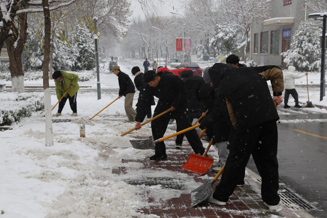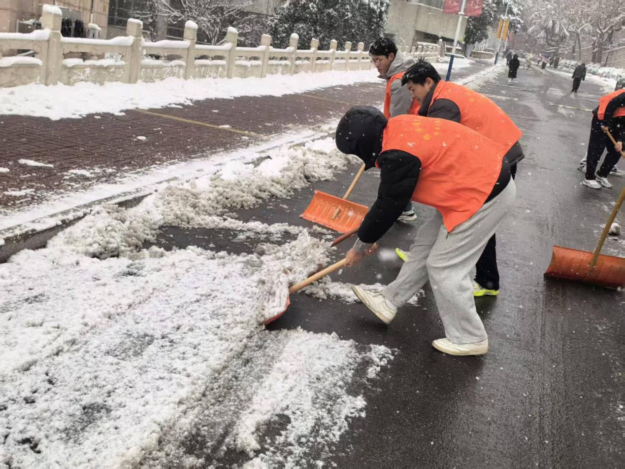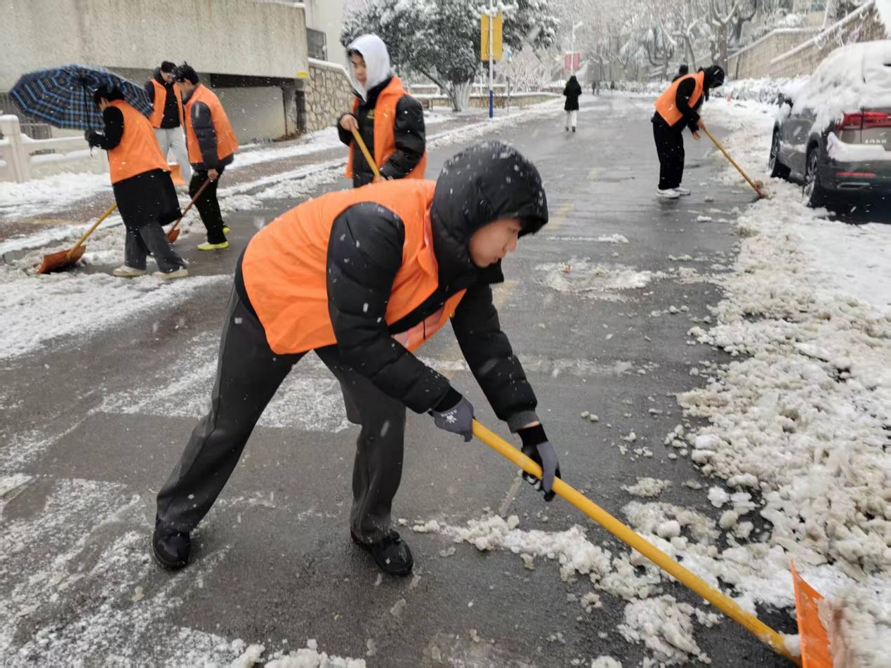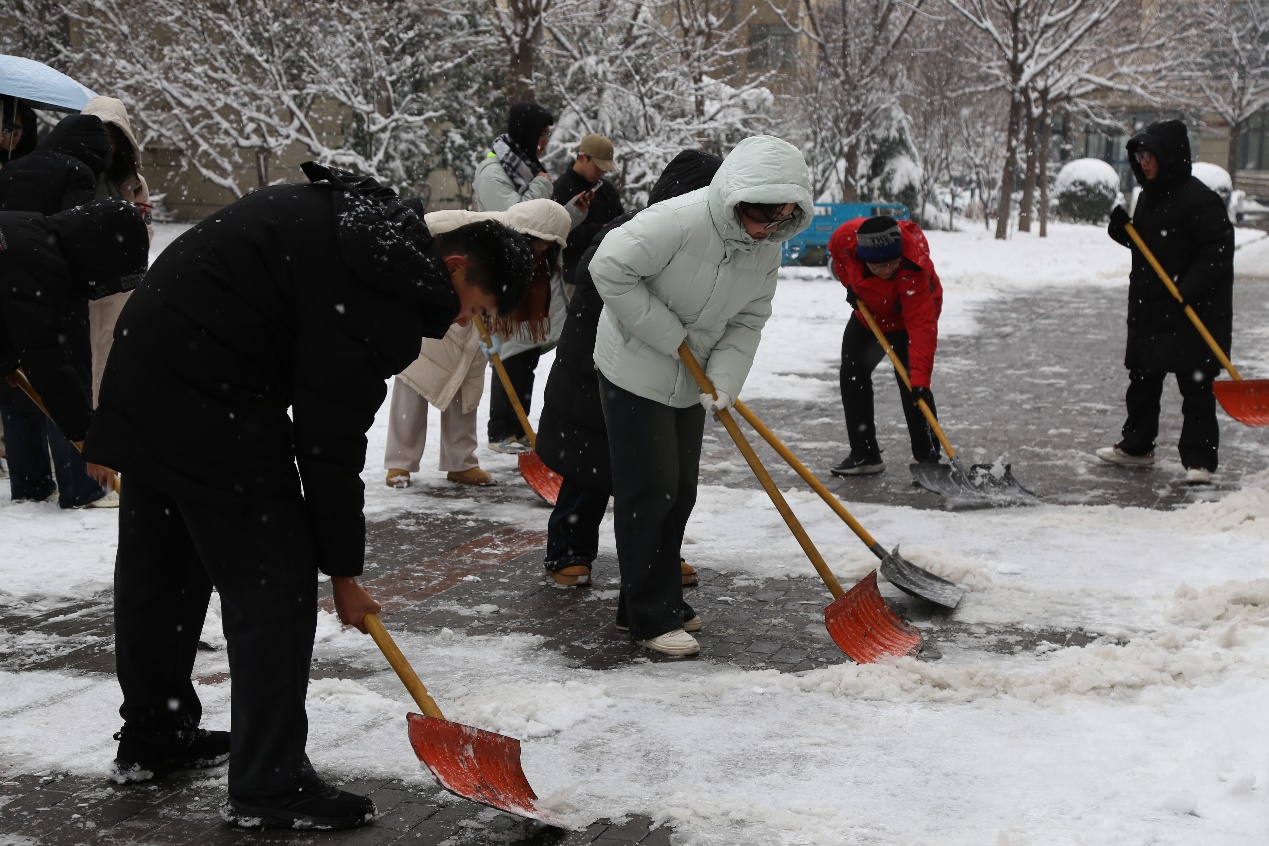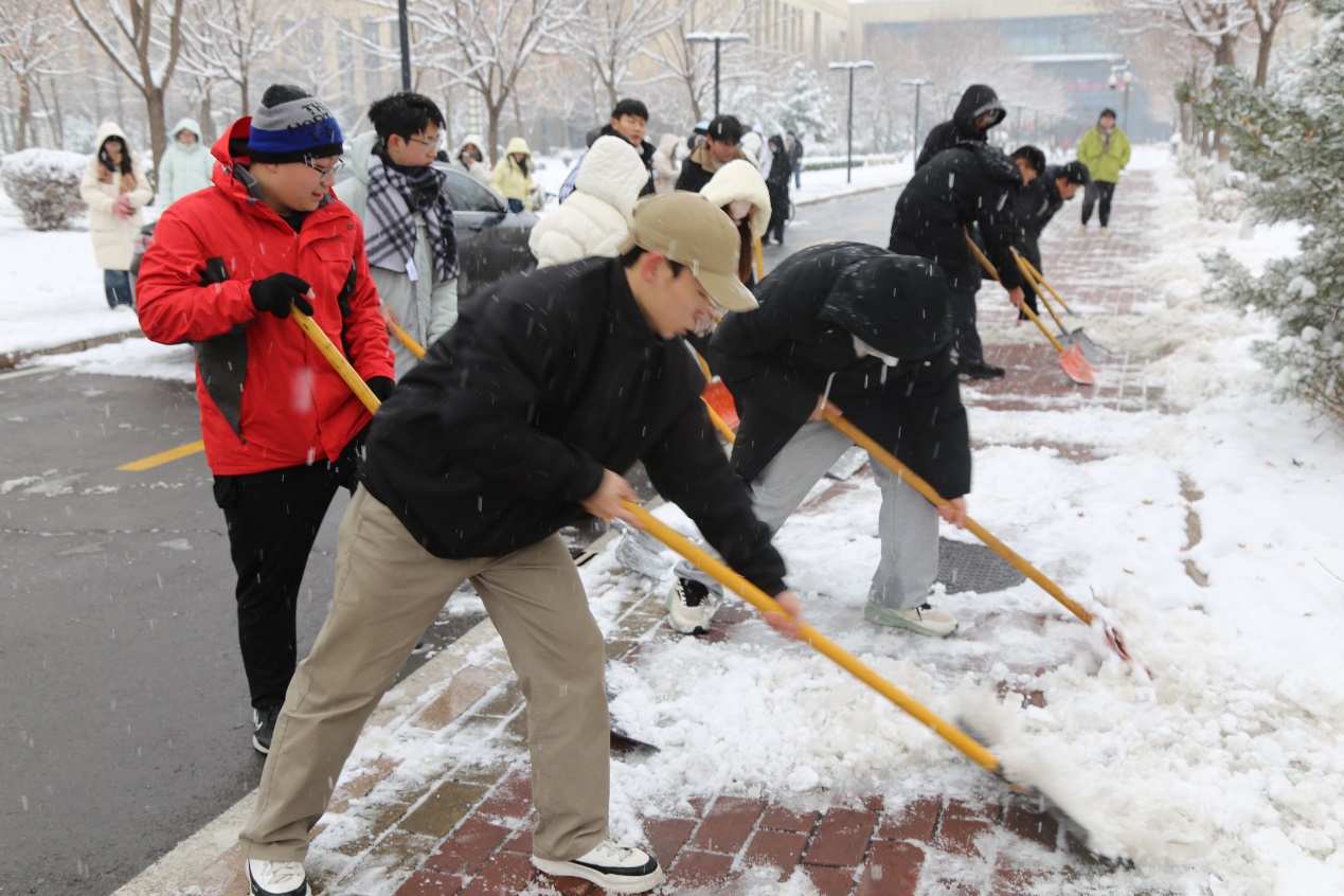 户外气温骤降,严寒丝毫未消弭全体成员的奉献热情,同学们主动响应、迅速行动,全力开展校园积雪清理劳动。大家手持各类清雪器具,齐心协力、并肩作战,对章丘校区七教西侧、九教北侧、七宿北侧、八宿北侧区域,舜耕校区行政楼广场前至西大门外区域的积雪进行彻底地清扫,全力消除出行安全隐患。清雪现场,同学们分工明确、协作无间,尽显团结奋进之风,以实干诠释校园情怀与责任担当�