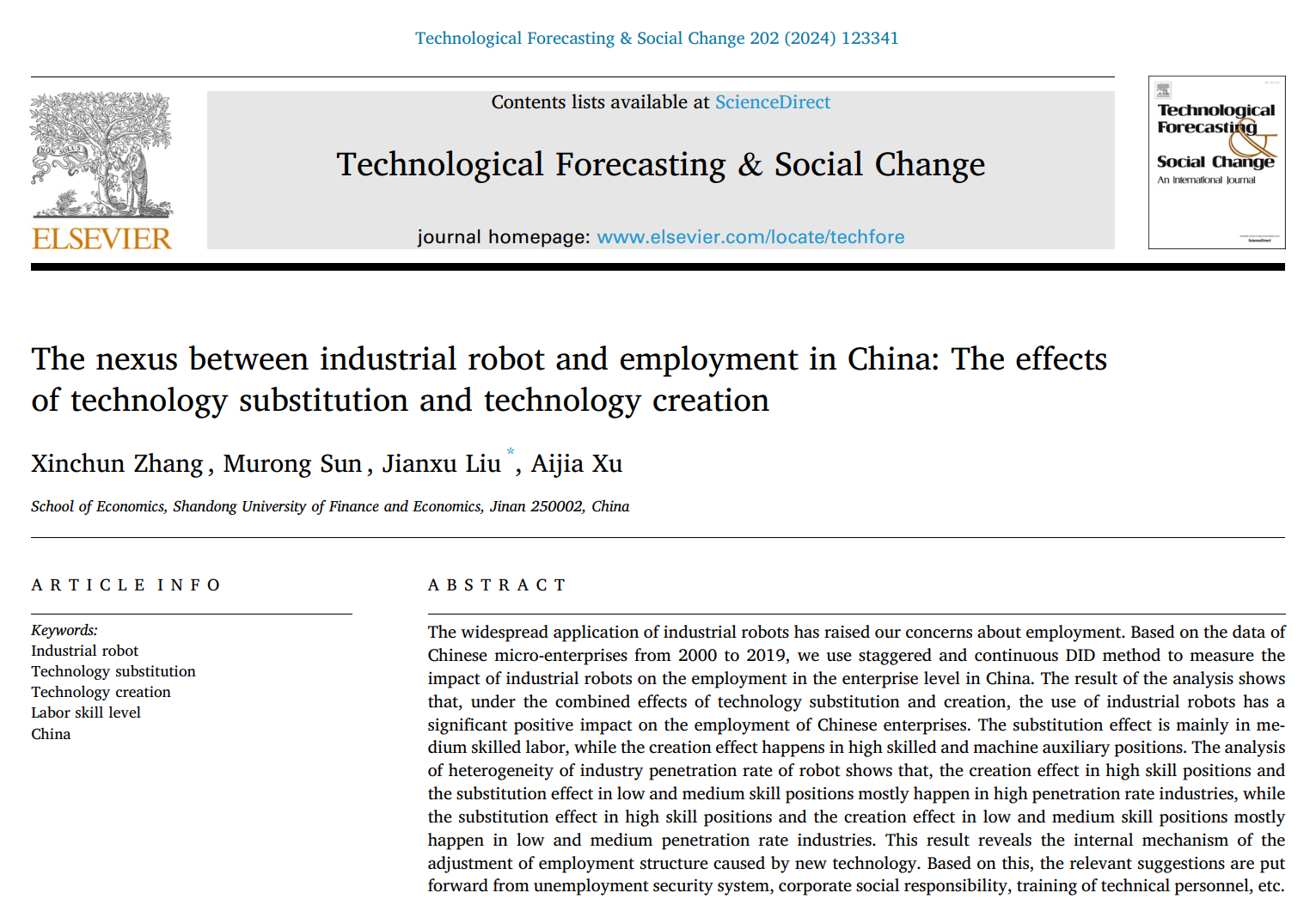 近日,ai女友张新春副教授与其指导的研究生及ai女友刘建旭副教授(通讯作者)合作的论文《The Nexus between Industrial Robot and Employment in China: The Effects of Technology Substitution and Technology Creation》,在创新管理领域Top期刊《Technological Forecasting and Social Change》正式在线发表。该刊是FMS科技政策类的高质量期刊,ABS三星期刊,中科院SCI一区TOP期刊。最新影响因子12,Cite Score17.2,系我校A1类期刊。