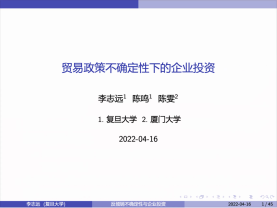 首先,李志远教授介绍了本研究的边际贡献,点明我国面临频繁的反倾销调查、反倾销调查伴随着贸易政策不确定性的显著上升这两大特征事实。随后,通过美国对华反倾销调查构建贸易政策不确定性,运用三重差分模型研究贸易政策不确定性变动对我国出口企业投资决策的影响;通过DID有效性检验、稳健性检验、异质性分析及机制检验等从多个角度探讨贸易政策的不确定性对企业投资的影响。最后,报告总结了研究结论与政策建议。报告认为,受反倾销不确定性影响的幸存出口企业实际投资会增加,但退出出口市场的受影响企业实际投资会减少;低生产率的幸存企业会倾向于通过产品转换和目的地转移应对贸易政策不确定性上升,而高生产率企业会通过产品质量升级应对贸易威胁。政府应当建立有效的不确定性对冲政策,鼓励企业深挖国内市场,以化解不确定性风险的负面影响,减轻受贸易政策不确定性影响的程度�