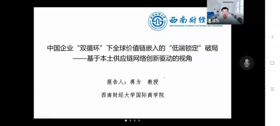蒋为教授围绕“中国企业� 双循环”下全球价值链嵌入的“低端锁定”破局——基于本土供应链网络创新驱动的视角”这一主题,从背景介绍、理论分析、数据选择和计量结果分析四个方面由浅入深地阐述了本土供应链网络与企业在全球价值链嵌入对创新影响的交互效应�