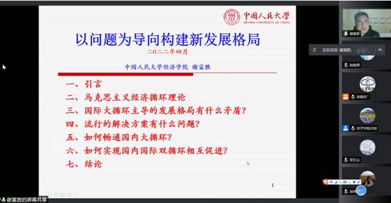 此次会议主题为“以问题为导向,构建新发展格局”,围绕这一主题,谢富胜教授从引言、马克思主义经济循环理论、国际大循环主导的发展格局有什么矛盾、流行的解决方案有什么问题、如何畅通国内大循环、如何实现国内国际双循环相互促进与结论七个部分环环相扣地对我国目前正在构建的新发展格局进行了全面剖析�