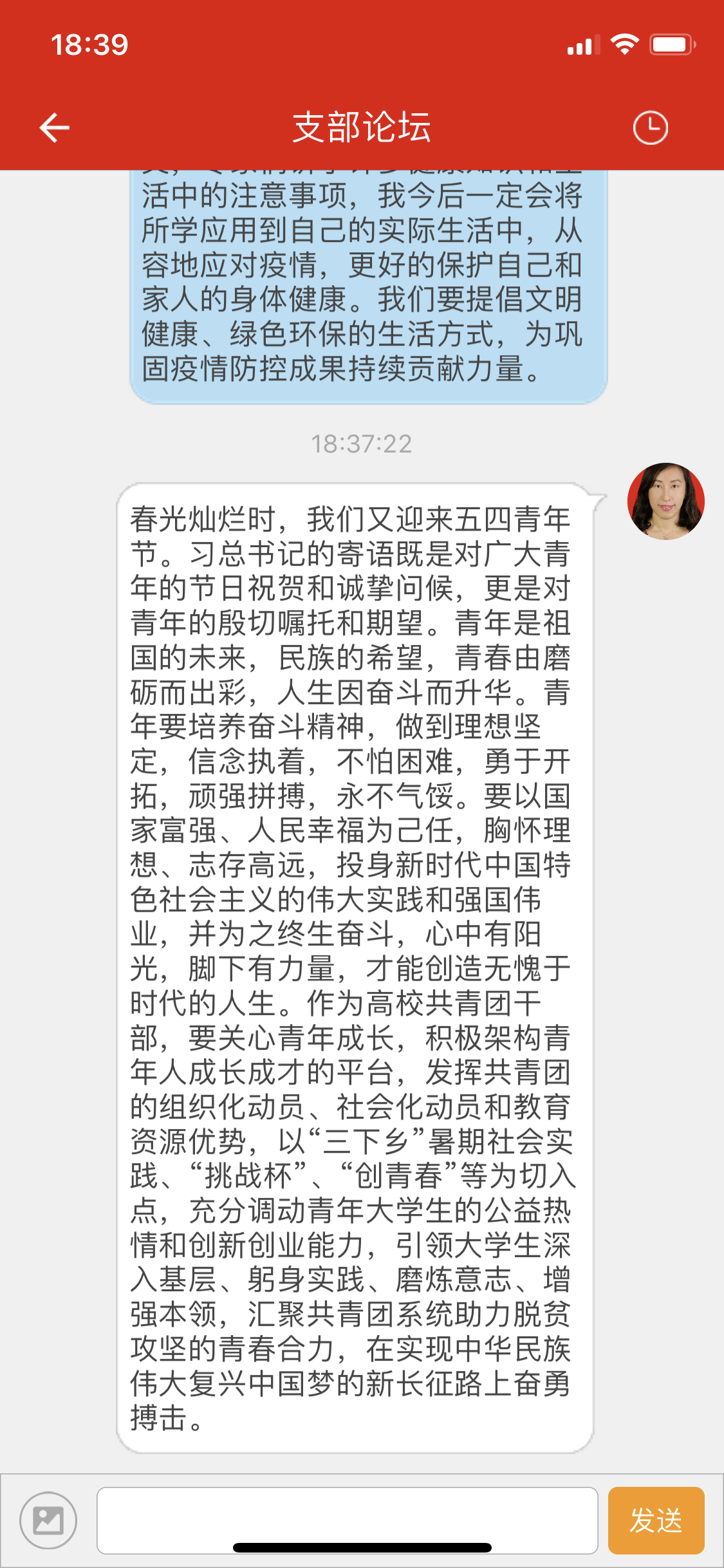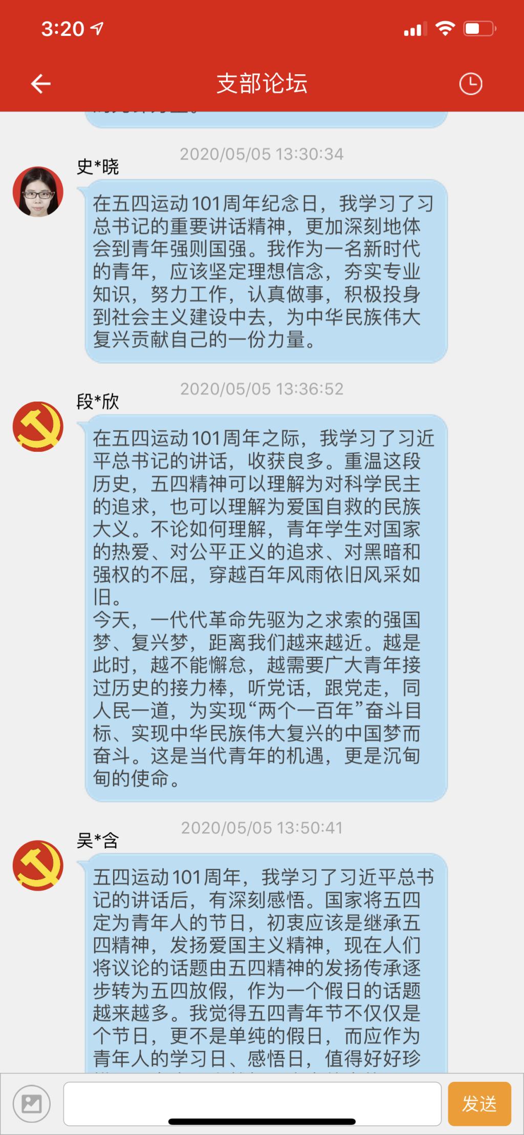 目前仍处于疫情防控的关键期,党员学习的场地从现场改为线上,但是大家的热情没有任何改变。会上,各支部书记首先向青年党员送上了节日的祝福,激励大家做有理想、有本领、有担当的新时代青年,为实现中华民族伟大复兴的中国梦而奋斗。随后大家深入学习了习近平总书记五四寄语、在纪念五四运动100周年大会上的重要讲话精神,重温了习总书记的青春故事,以及习总书记历年来“五四讲话”中的经典语录。党员同志们结合学习和实际情况在线进行了充分的交流和讨论。教工党员李冰封深情地说:“虽然我已经过了青年的年龄,但是我一直拥有着青年的心态,愿意绽放自己的青春,为国家培养更多的人才”;即将成为一名西部志愿者的学生党员王克轩表示,立志去祖国最需要的地方去,建功立业,实现青春梦想;王振欣向支部党员分享了抗疫期间担任志愿者的体会,疫情爆发后,她帮助社区宣传普及抗疫知识,为防控执勤点捐赠物资,坚守工作第一线,并帮助解决辖区村民的困难……用青春的热血实现了一名青年党员的担当。