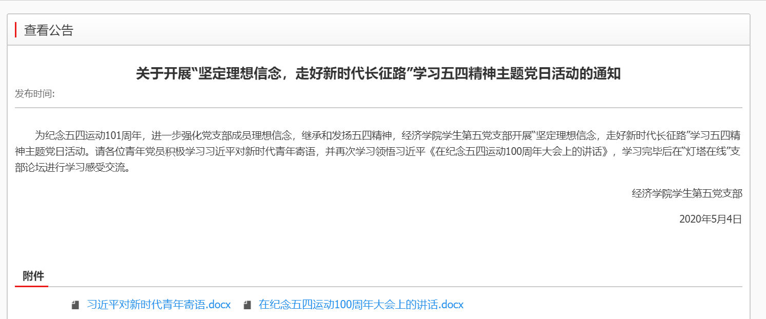 党委组织12个师生党支部开展了“坚定理想信念,走好新时代长征路”学习五四精神线上主题党日活动。活动由各党支部书记主持,通过 “学习强国”学习平台和灯塔-党建在线平台进行。