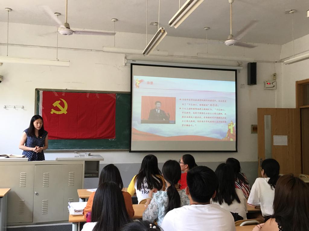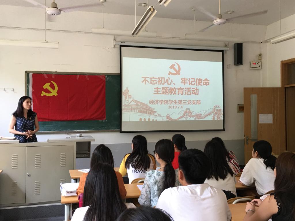 副院长彭留英在舜耕校区1号教学楼为学生第三党支部上“不忘初心,牢记使命”主题教育党课。