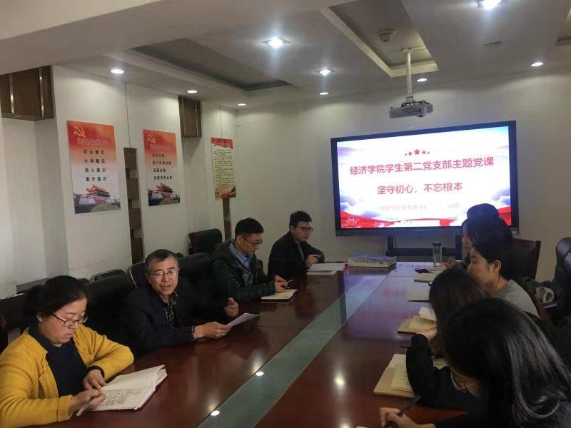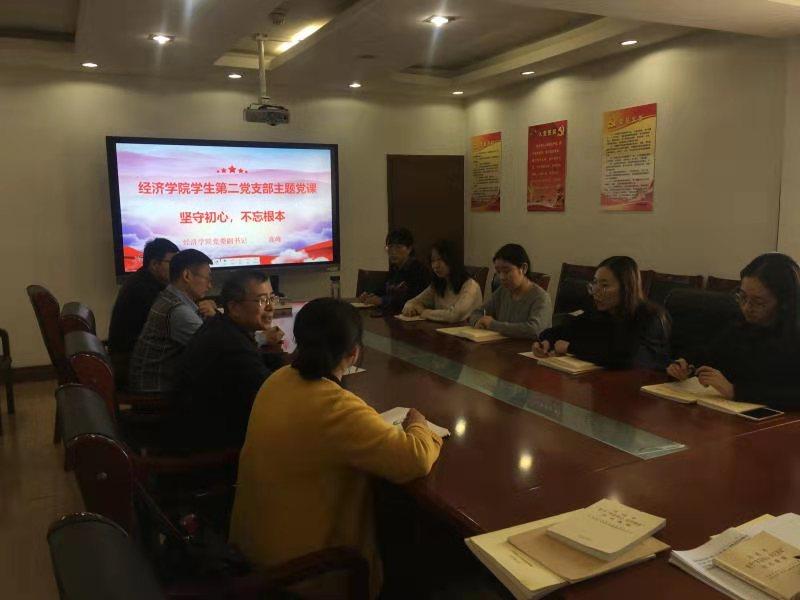 2019�10�25日中午,院党委副书记高峰在办公楼1208会议室为经济学院学生第二党支部上了一堂题为“坚守初心,不忘根本”的党课,学生第二党支部全体党员聆听了此次党课。党课由学生第二党支部书记裴斐主持�