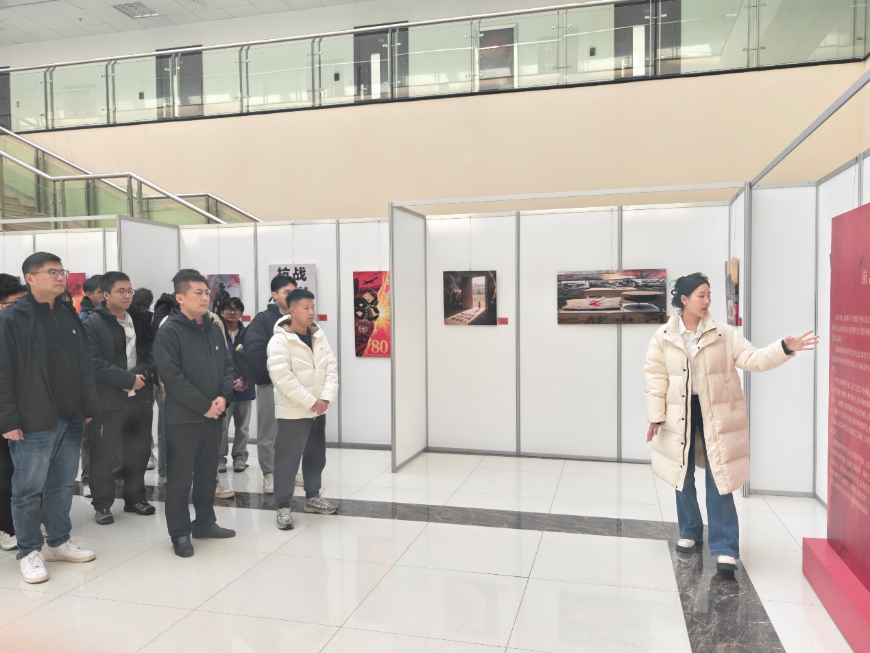 展览分为“铭记历史”“珍爱和平”“开创未来”三个篇章,通过中国书画、摄影照片、海报招贴、数字艺术等丰富的艺术表现形式,以丹青铭刻历史、用艺术照亮未来,既有对革命先辈奋斗历程的细腻刻画,也有对新时代经济发展成就的生动展现,更有财大学子立足专业视角对“经世济民”初心的艺术诠释。参观过程中,同学们在讲解员的引导下沉浸式感悟作品背后的历史温度与精神力量,仿佛重回那段艰苦卓绝的抗战年代,深切感受到革命先辈为民族解放展现出的英勇不屈和坚定信念�